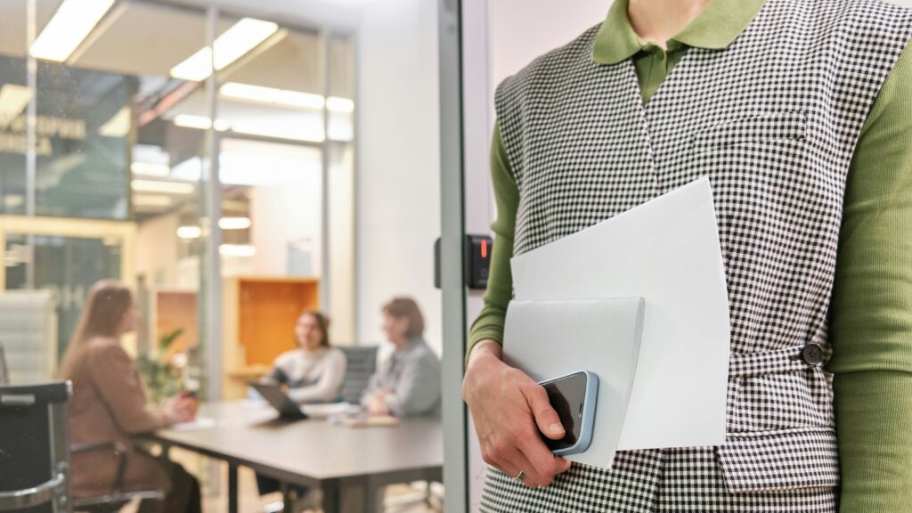 面接が終わったら受け取った書類やメモなどをカバンにしまい、立ち上がって感謝を伝えます。退室するときは一言添えて、面接室をあとにします。途中、社員とすれ違うときは適宜挨拶しましょう。