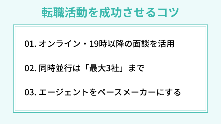 また、複数社を同時進行する際は、最大3社までに絞るとミスや過負荷を防げるでしょう。オンライン面談や19時以降の選考に対応している企業も増えているため、現職の繁忙期でも対応できます。