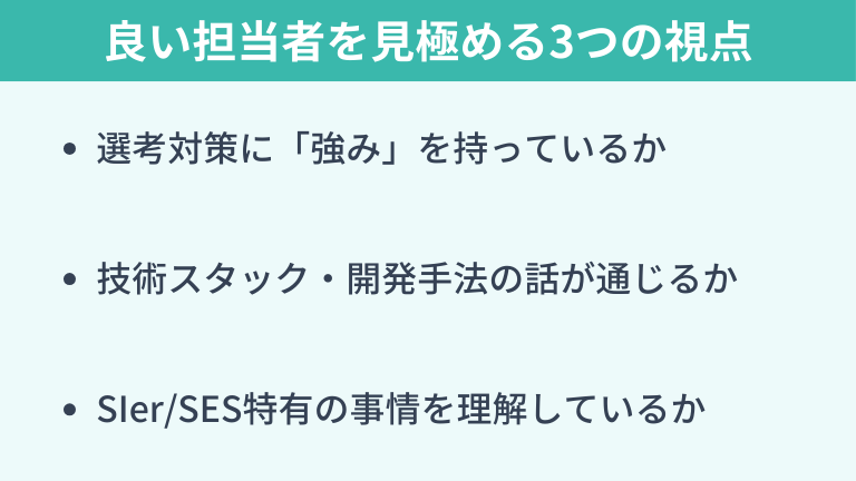 特にSIerやSESの繁忙期と重なると、3社以上とのやり取りは非現実的です。最終的に絞る基準として、担当者の技術理解の深さや求人提案の精度、レスポンスの早さから検討しましょう。