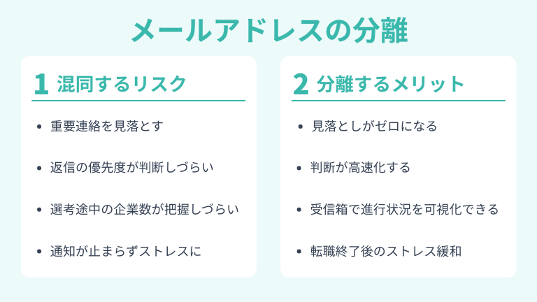 複数のエージェントを利用するとメールが急増しがちです。私用のメールアドレスと同じ受信箱に混ざることで求人の見落としや返信の遅延、混乱が発生します。メールアドレスを混同する場合のリスクと、分離するメリットは確認しておきましょう。