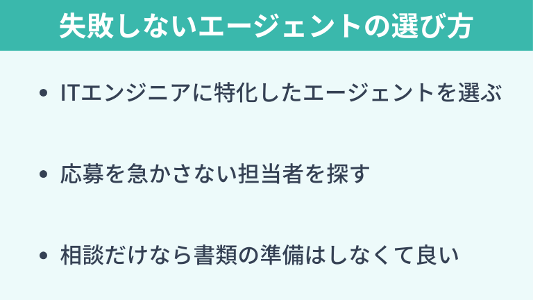 相談段階でも「市場のリアル」を聞く必要があるため、技術理解が浅い担当者と話すと、時間の無駄です。相談だけの利用でも、エンジニア特化のエージェントを選びましょう。
