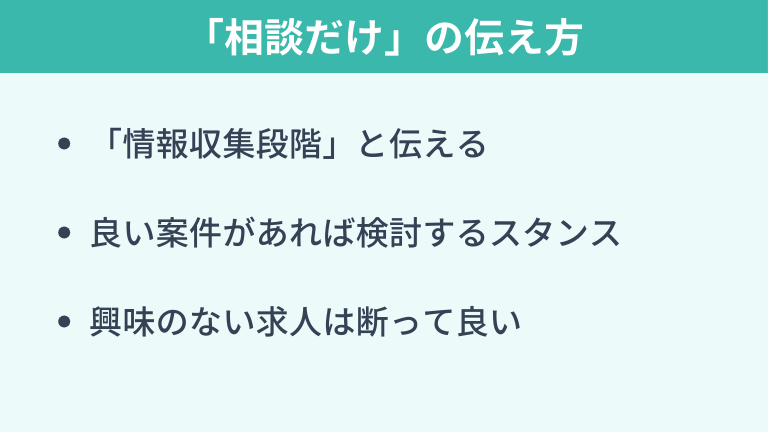 したがって、「今すぐではないが、良い案件があれば検討する」と、柔らかいスタンスをとるのがおすすめです。柔軟な姿勢を示せば、相談だけの立場を保ちながら、担当者とも良い関係を築けます。