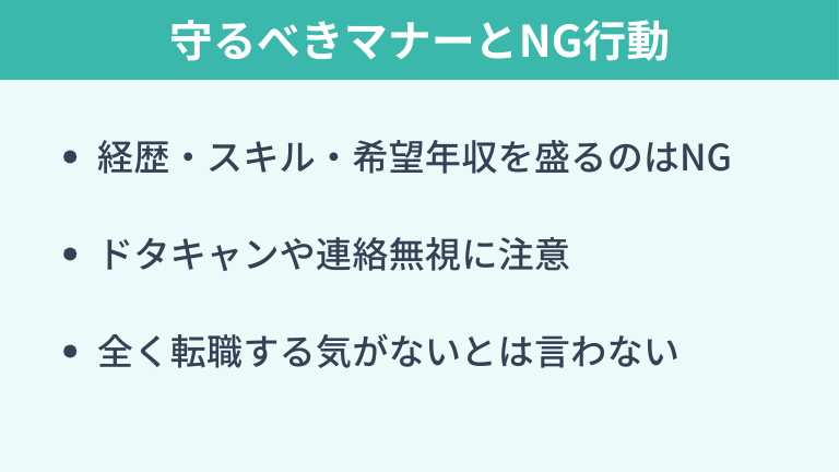 相談だけでも、予約した面談を無断キャンセルしたり、連絡を放置したりする行為は避けましょう。担当者との信頼関係は、あなたの提案品質にも影響を与えます。丁寧に対応するほど、あなたの市場価値を正しく理解してもらえ、将来的な紹介案件も最適化されます。