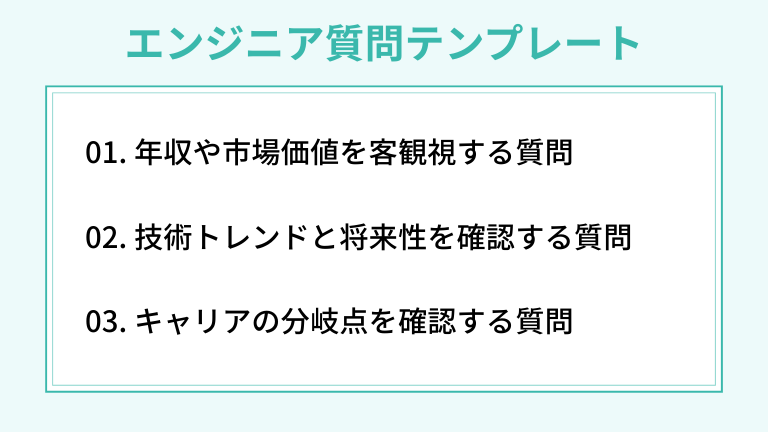 相談をするにあたって、まずは年収や市場価値が客観視できる質問をしてみましょう。具体的な質問と目的は以下の通りです。