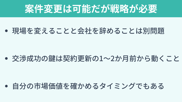 【結論】退職せずに案件を変えることは可能だが戦略が必要