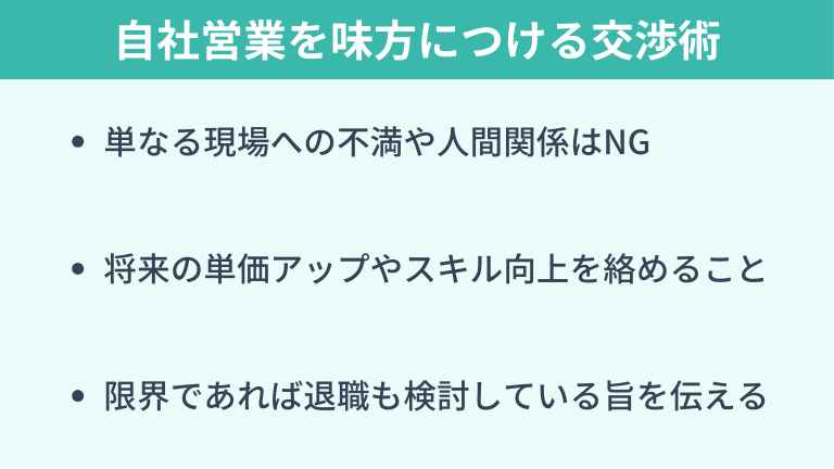 営業担当と交渉する際には、自分の将来像やキャリア形成を軸に話すことが有効です。例えば「今の現場では新しい技術が学べないため、もっとレベルが高い案件に携わるなかで成長したい」と伝えると、前向きな意図が伝わりやすくなります。