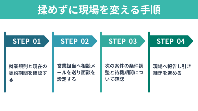 現場を変えるには感情的に動くのではなく、段階を踏んだ冷静な行動が必要です。ここでは、トラブルを避けながら穏便に案件を変更するためのステップを解説します。