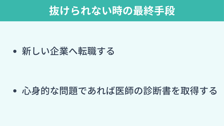 正当な理由をもって交渉しても、現場を離れられない状況に直面することもあります。その場合は、我慢し続けるのではなく、自身の健康やキャリアを守るために「最終手段」を検討しましょう。
