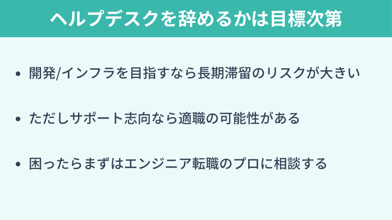 もし「本当は開発や設計構築、インフラに携わりたい」と思っているのなら、長期間ヘルプデスク業務に携わるとキャリア上のリスクが大きくなります。