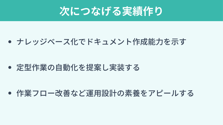 作業フローで煩雑な箇所があれば、問い合わせの導線を見直して無駄な工程を省く提案を行ってみましょう。運用しやすい環境設計ができるかどうかは、特に保守運用エンジニアには欠かせない素養です。
