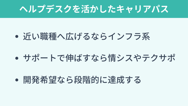 また開発にこだわらず、とにかくIT領域に携われば十分という場合は、ヘルプデスクでの経験を活かしてテクニカルサポートや社内SEに挑戦するのもよいでしょう。ITと深い製品知識の両方を身につけることで組織に欠かせないスペシャリストを目指すのもキャリアの選択肢の一つです。