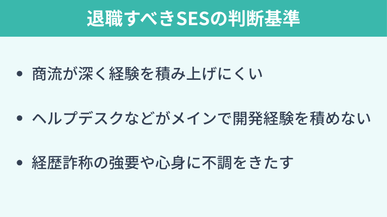 すべてのSES企業が悪いわけではありませんが、技術力向上の見込みがない現場では早めの判断が必要です。以下の特徴に当てはまる場合、キャリアへの悪影響を避けるため退職を検討すべきでしょう。