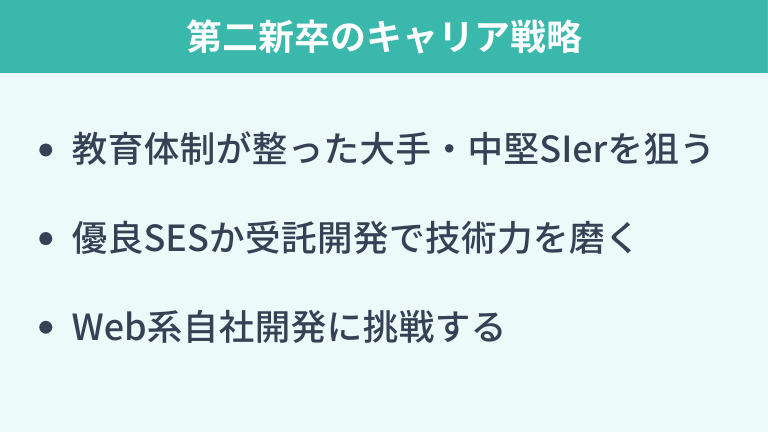 第二新卒での転職では、転職先の環境選びが重要です。同じ失敗を繰り返さないために、教育体制や案件内容をしっかり確認しましょう。以下では、第二新卒エンジニアが目指すべき3つのキャリアパスを紹介します。