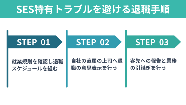 また、SESの場合は客先との契約更新のタイミングも絡んできます。常駐先のプロジェクトの進み具合や稼働契約の終了時期も把握し、自社・客先・ご自身が三方よしとなる時期での退職を目指しましょう。どのタイミングが最善かまとめた記事記事もあるので、万全な対策を打ちたい場合は参考にしてください。