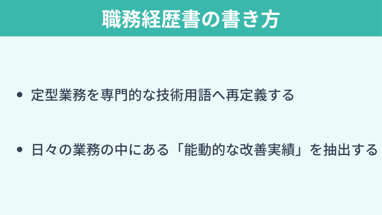 業務内容を「誰に・何を・どう提供したか」の視点で分解し、専門性のある言葉に変換することで、採用担当者に技術職としての適性をアピールできます。