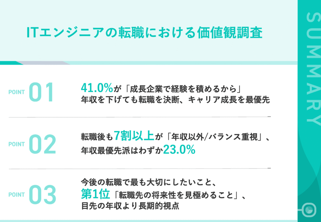 今回の調査では、ITエンジニアの転職において「年収アップ=成功」という従来の価値観から、成長機会、働き方、職場環境といった多様な要素を重視する新しい価値観について生の声を得ることがわかりました。物価上昇や働き方改革が進む中、エンジニアたちは目先の年収よりも長期的なキャリア形成や生活の質を重視し、自分の価値観に基づいた転職選択を行っています。企業にとっては、給与だけでなく成長環境や働きやすさを提供することが、優秀な人材を獲得・維持する上で重要であることが示唆されます。転職を検討する方にとっては、自己分析を十分に行い、優先順位を明確にすることで、年収以外の要素も含めた満足度の高い転職を実現できるでしょう。