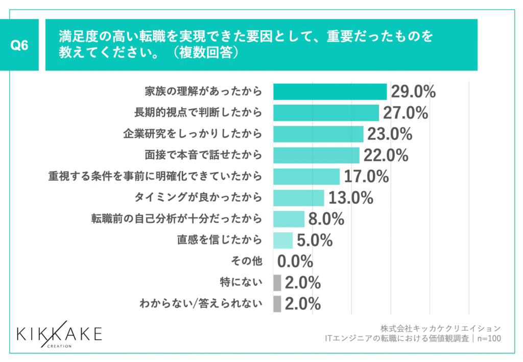 「Q6.満足度の高い転職を実現できた要因として、重要だったものを教えてください。(複数回答)」(n=100)と質問したところ、「家族の理解があったから」が29.0%、「長期的視点で判断したから」が27.0%、「企業研究をしっかりしたから」が23.0%という回答となりました。