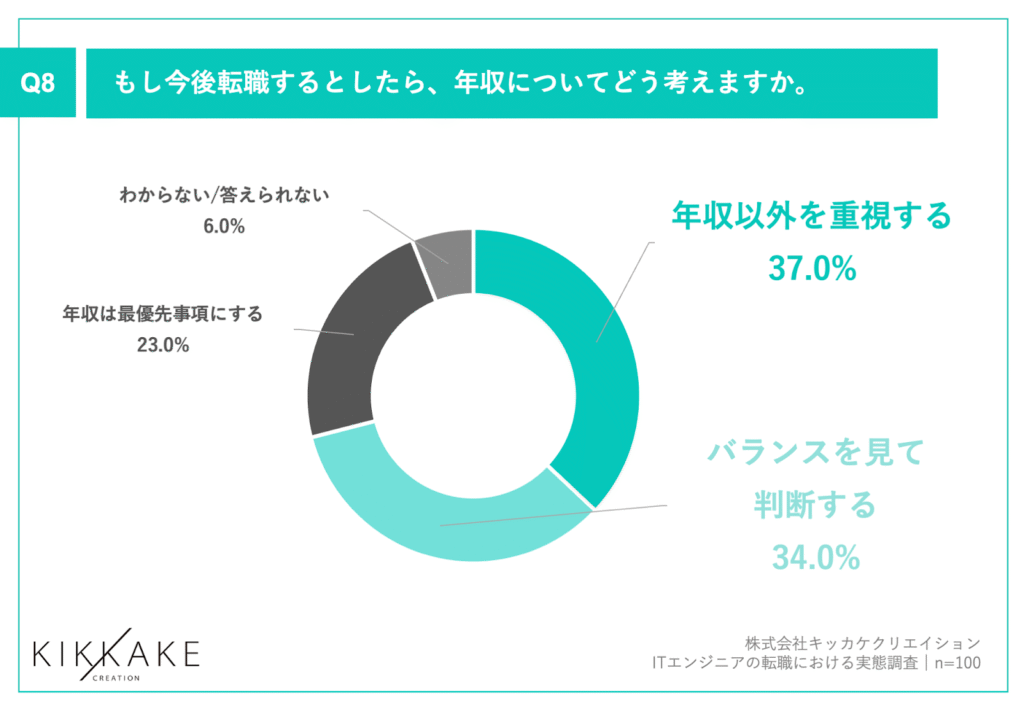 「Q8.もし今後転職するとしたら、年収についてどう考えますか。」(n=100)と質問したところ、「年収以外を重視する」が37.0%、「バランスを見て判断する」が34.0%、「年収は最優先事項にする」が23.0%という回答となりました。